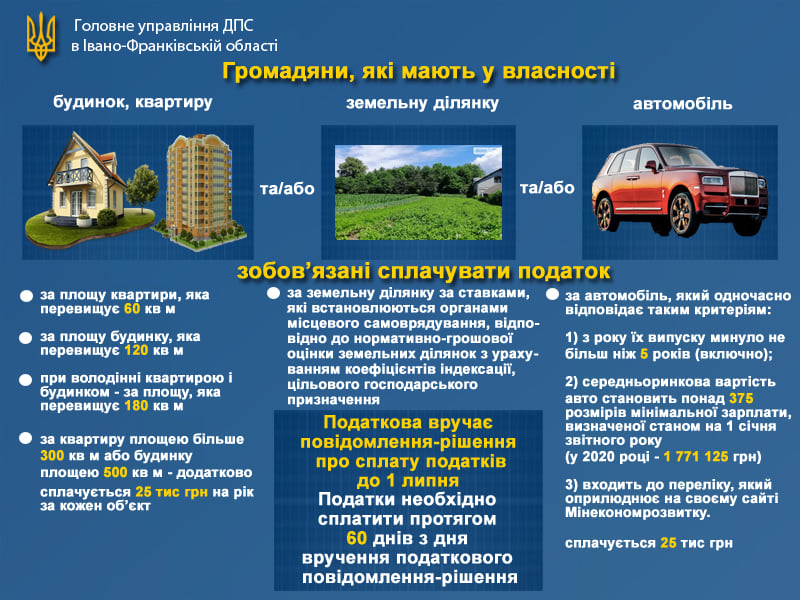 Громадяни, які мають у власності будинок, земельну ділянку, автомобіль зобовязані сплачувати податок!